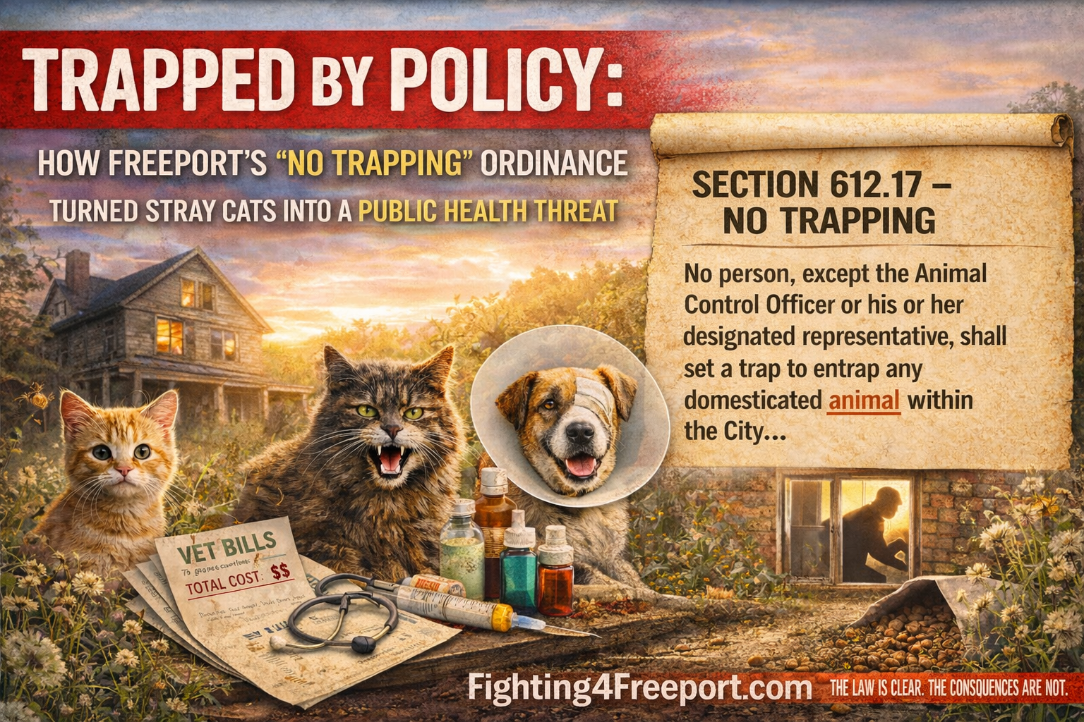 Freeport’s “No Trapping” ordinance was meant to control the stray cat population—but years later, residents are seeing the opposite. As colonies grow and spread into neighborhoods, pet owners are facing rising vet bills, disease exposure, and safety risks in their own yards. The law is clear. The consequences are now impossible to ignore.