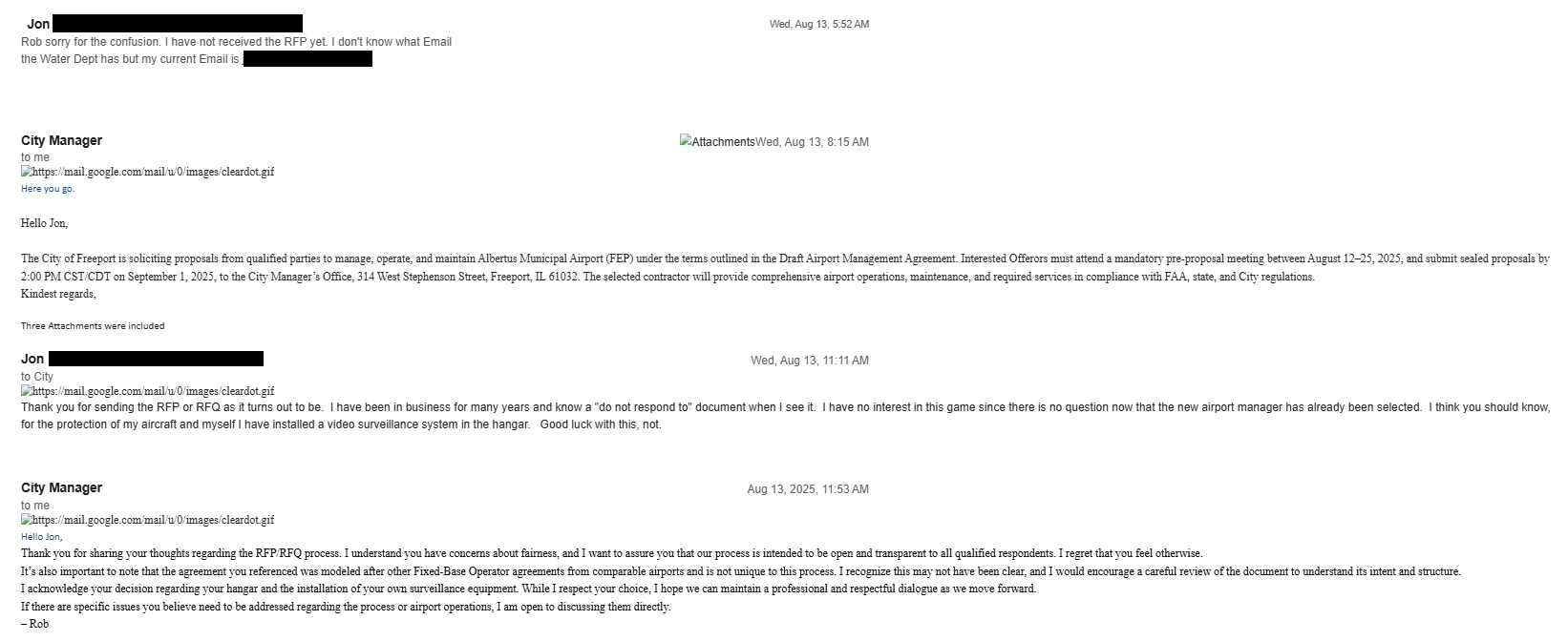 Later that morning — John XX replied, “I know a ‘do not respond to’ document when I see it. There is no question now that the new airport manager has already been selected.” He added that he had installed surveillance cameras in his hangar to protect himself and his aircraft.