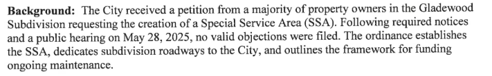 City Manager Rob Boyer explained that the SSA followed a petition signed by a majority of Gladewood subdivision property owners. No formal objections were filed. City staff recommended passage, which now imposes an additional $400 annual SSA tax on approximately 16 landowners in the subdivision, lasting for the next 15 years.