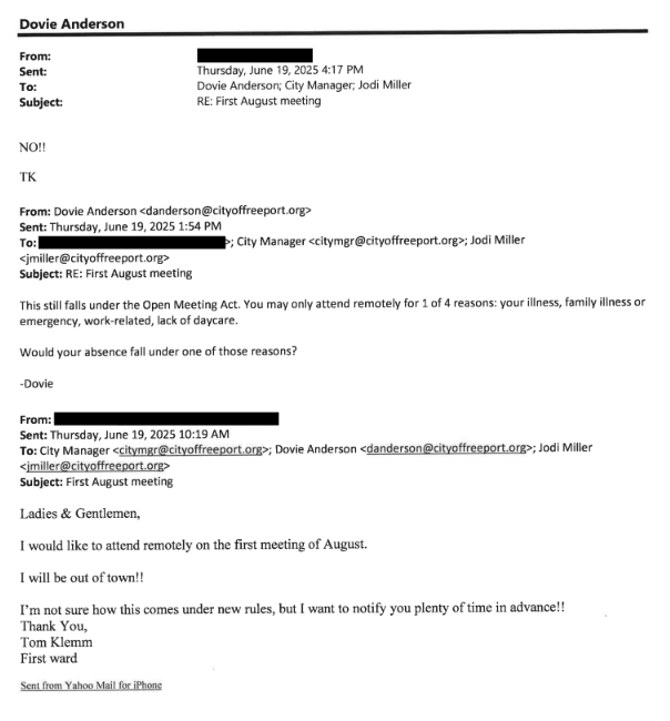 Following the cancellation, Fighting4Freeport filed a FOIA request to City Clerk Dovie Anderson seeking all official communications from council members and the Mayor explaining their inability to attend.