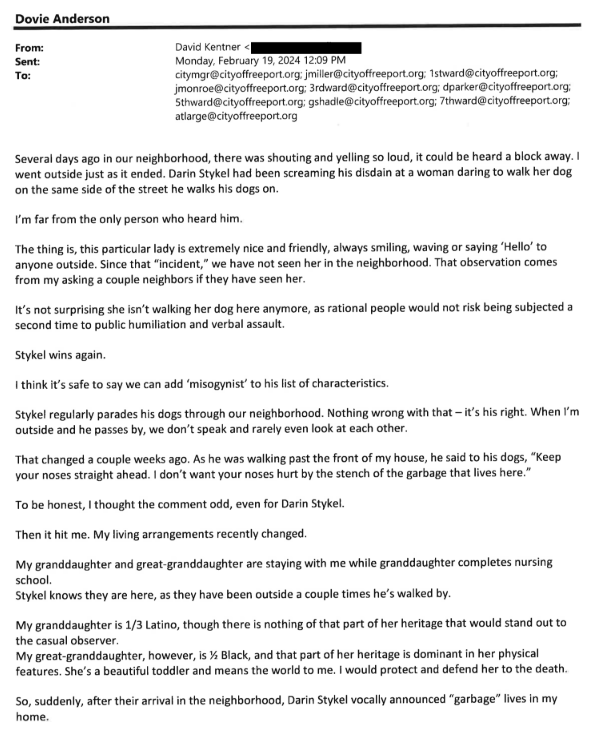 A February 2024 email obtained via FOIA from former Freeport Police Chief David Kentner warned city leaders of a dangerous pattern of behavior by Stykel, including verbal harassment of neighbors and racist undertones targeting Kentner’s own family.