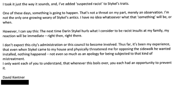 Kentner’s letter then turned more personal. He recounts a moment when Stykel walked past his home and loudly declared to his dogs: